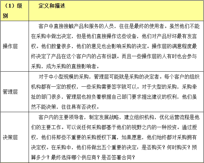 3、組織結(jié)構(gòu)分析:銷售以人為本,銷售人員在銷售前,應(yīng)該先將可能與采購相關(guān)的客戶挑出來,分析他們在采購中的作用,必須避免在不了解情況時(shí)盲目開始銷售。在組織架構(gòu)分析時(shí),銷售人員應(yīng)該從下面三個(gè)維度進(jìn)行分析: